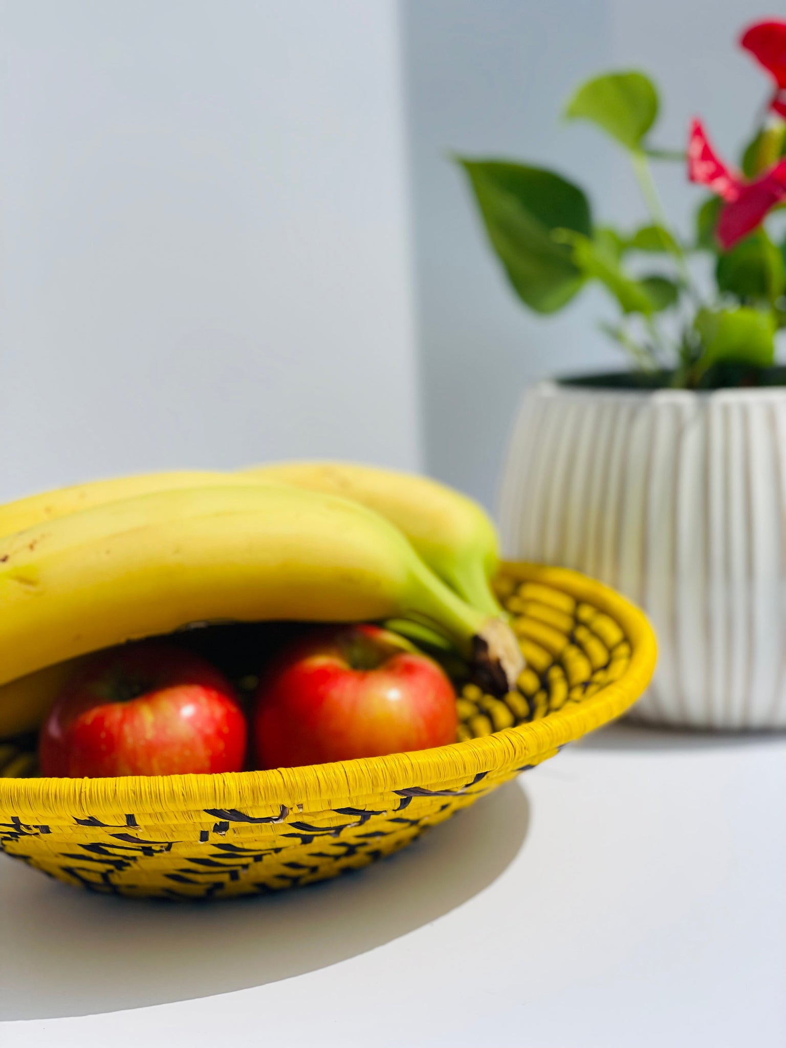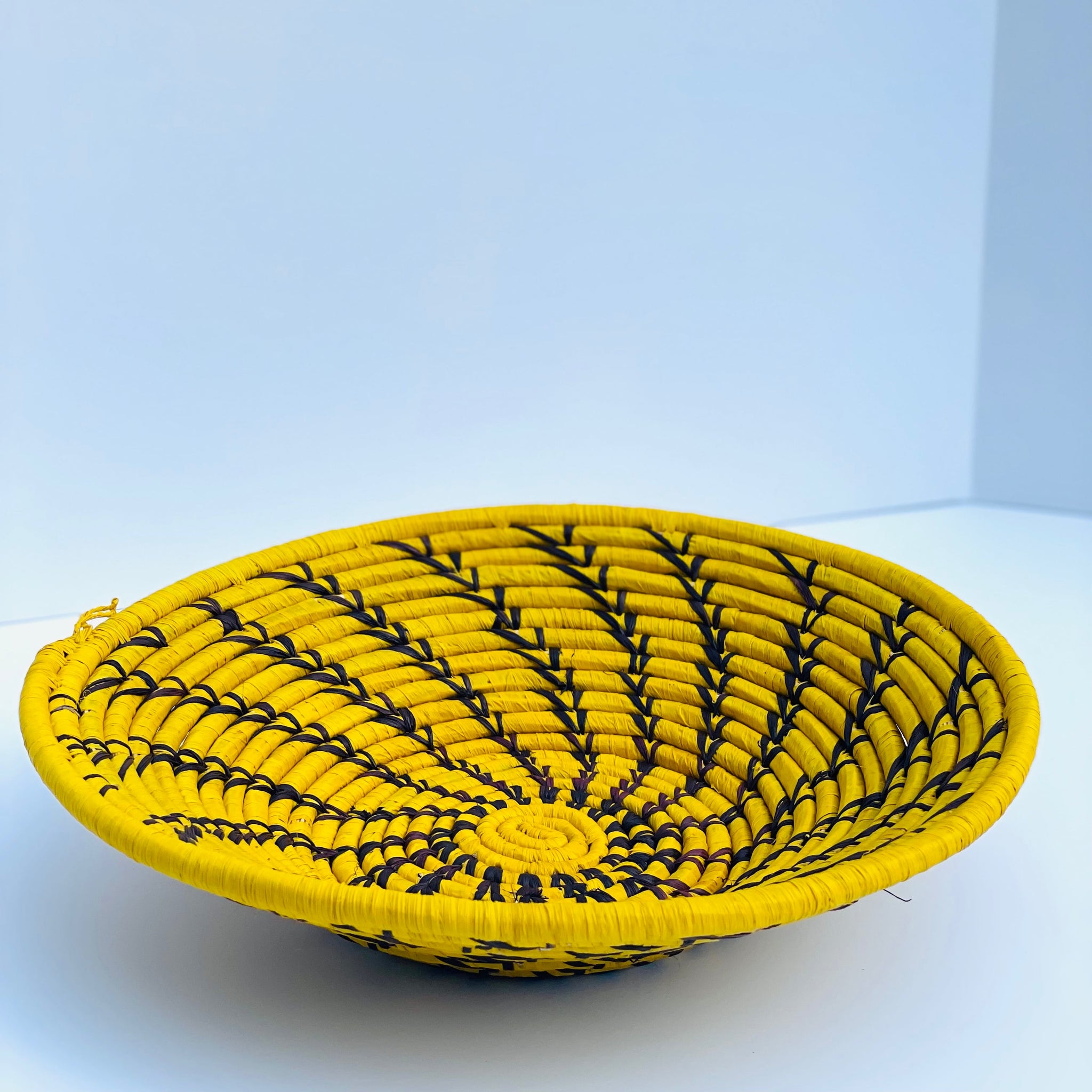 12" Yellow Raffia Grass African Basket with Black Swirl